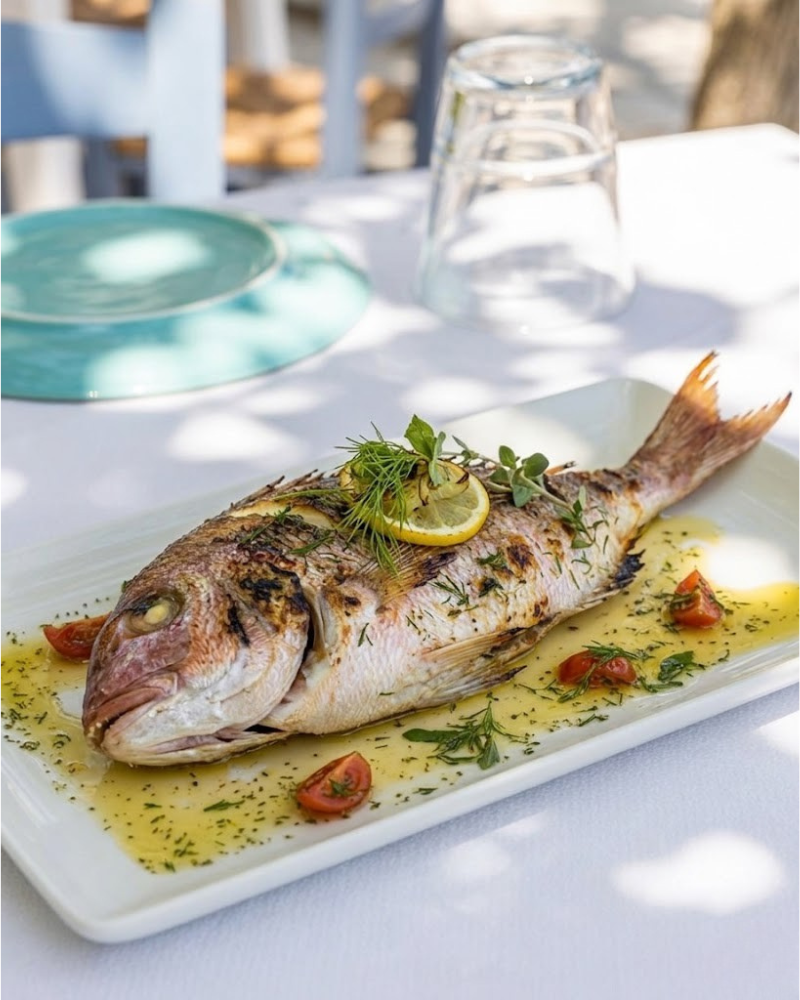 • Ψάρι ημέρας γεμιστό με αρωματικά χόρτα στον φούρνο